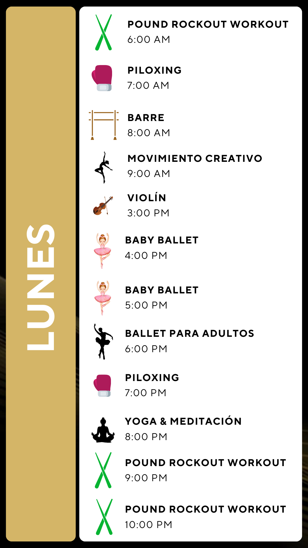 | 9:00 am | Movimiento Creativo | Movimiento Creativo | Yoga y Meditación | Pound | ||